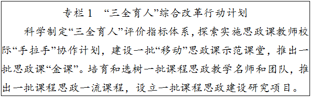 2.推进高校“三全育人”综合改革。巩固和拓展“三全育人”综合改革试点区建设成果,贯彻“三全育人”湖南共识,加快构建目标明确、内容完善、标准健全、运行科学、保障有力、成效显著的高校思想政治工作体系。深化高校思政课改革创新,联结思政小课堂与社会大课堂、网络大空间,推动课堂教学和实践教学有机结合,充分运用丰富的红色教育资源和厚重的历史文化资源,紧密联系中国共产党和中国人民的奋斗历程,办好学校思想政治理论课。加强互联网思想政治工作载体建设和新媒体平台应用。培养一批思想政治工作名师、优秀团队、中青年骨干和优秀辅导员。
