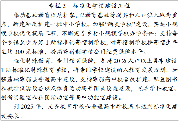 1.改善义务教育学校办学条件。实施标准化学校建设工程,到2025年,义务教育学校基本达到标准化建设要求,彻底解决大通铺、学生洗澡和如厕难等问题。优化城乡义务教育学校布局,加强乡村小规模学校和乡镇寄宿制学校建设,重点支持每个乡镇至少办好1所标准化寄宿制学校。办好义务教育阶段公办学校,有序扩大城镇学位供给,保障农村转移人口随迁子女平等享有基本公共服务,健全义务教育大班额防控长效机制。落实县域内城乡义务教育学校建设标准、教职工编制标准、生均公用经费基准定额、基本装备配置标准统一,强化分类施策。